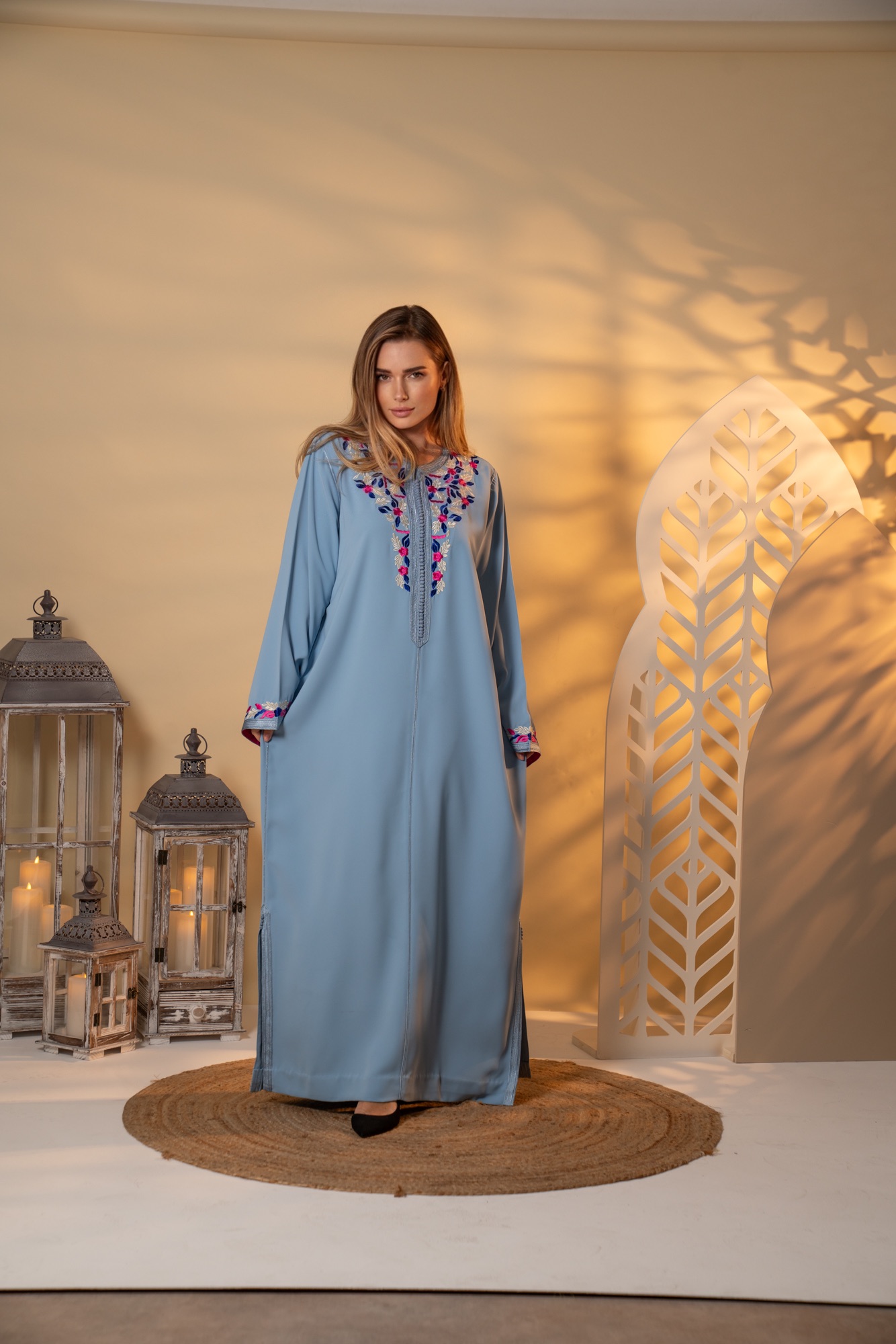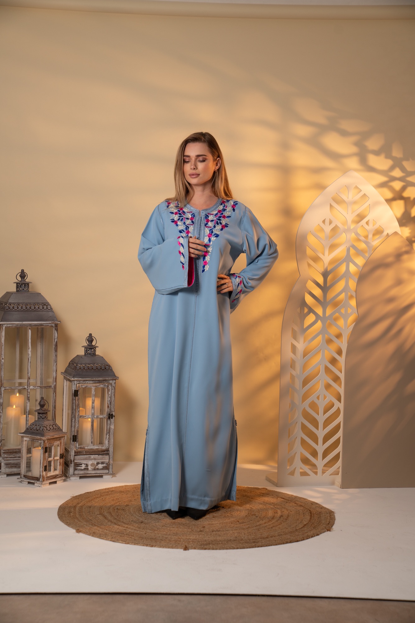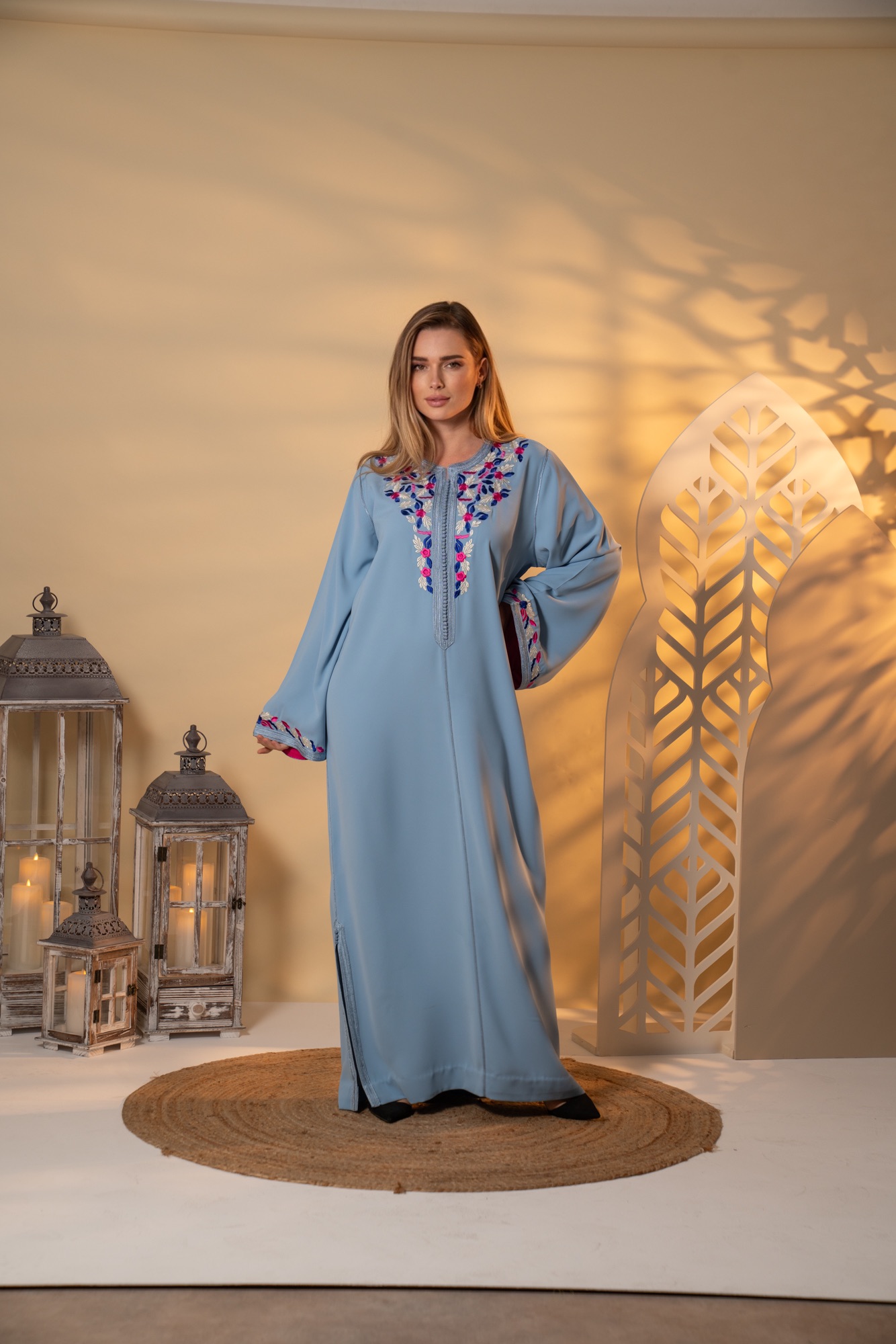 FAIROUZ, ce magnifique caftan en tissu crepe élégamment doublé en satin de soie. Sublimé par des broderies, il allie douceur et raffinement pour une allure sophistiquée et unique.